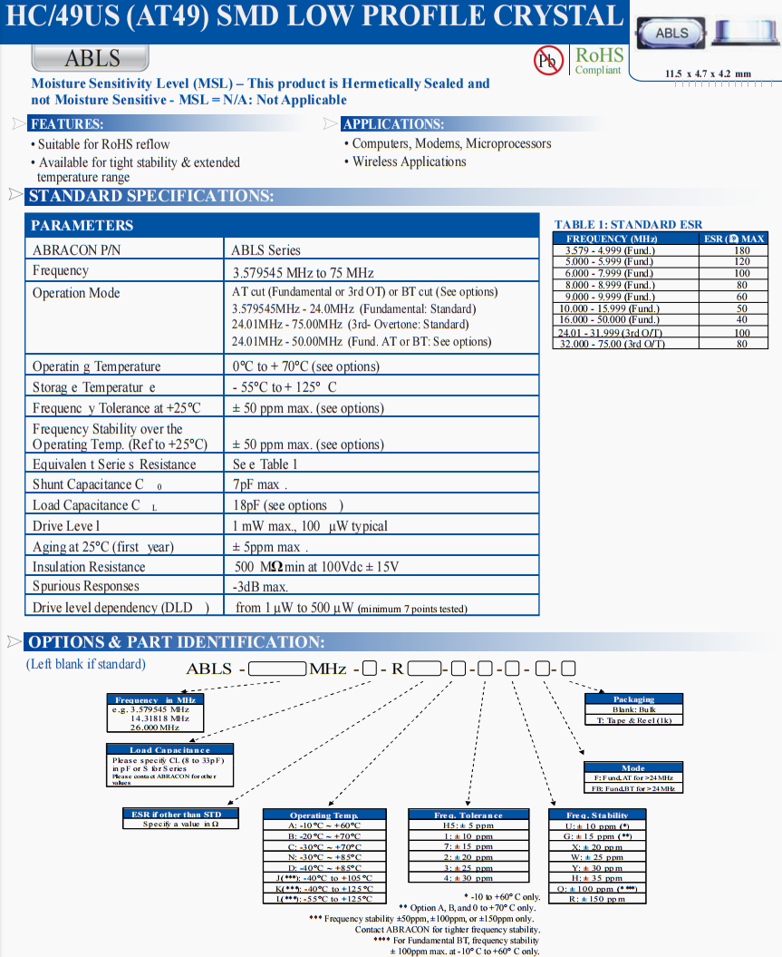 | ABLS-13.500MHZ-B4-T | Abracon | ABLS | 13.5 MHz | ±50ppm | ±30ppm | 18 pF |