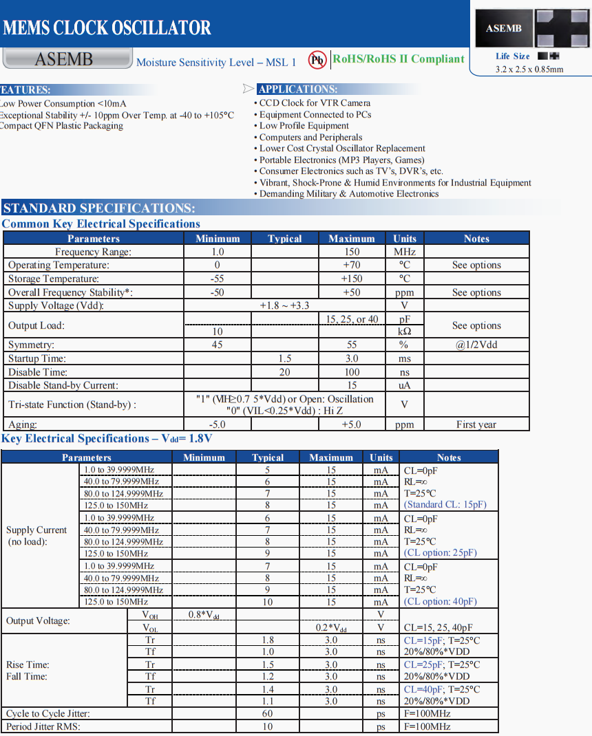| ASEMB-80.000MHZ-LY-T | Abracon晶振 | ASEMB | XO | 80 MHz | 1.8V ~ 3.3V | ±10ppm |