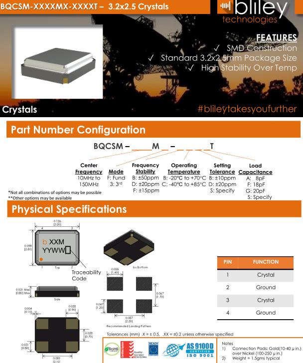 Bliley晶振,BQCSM晶振,BQCSM-20.000M-FDBBAT晶振,超小型表面貼片型SMD晶振,最適合使用在汽車電子領(lǐng)域中,也是特別要求高可靠性的引擎控制用CPU的時鐘部分.低頻晶振可從7.98MHz起對應(yīng),小型,超薄型具備強防焊裂性,石英晶體在極端嚴(yán)酷的環(huán)境條件下也能發(fā)揮穩(wěn)定的起振特性,產(chǎn)品本身具有耐熱,耐振,耐撞擊等優(yōu)良的耐環(huán)境特性,滿足無鉛焊接以及高溫回流溫度曲線要求,符合AEC-Q200標(biāo)準(zhǔn).Bliley Technologies Inc. 最初于 1930 年作為 Bliley Piezo-Electric Company 成立。最初,我們?yōu)闃I(yè)余無線電市場制造石英晶體。在 1930 年代中期,我們的客戶和產(chǎn)品很快擴大到與新興的軍事和商業(yè)通信領(lǐng)域的利益相匹配,我們的名稱更名為 Bliley Electric Company。1939 年,我們是最大的水晶公司,擁有 11 名員工。
