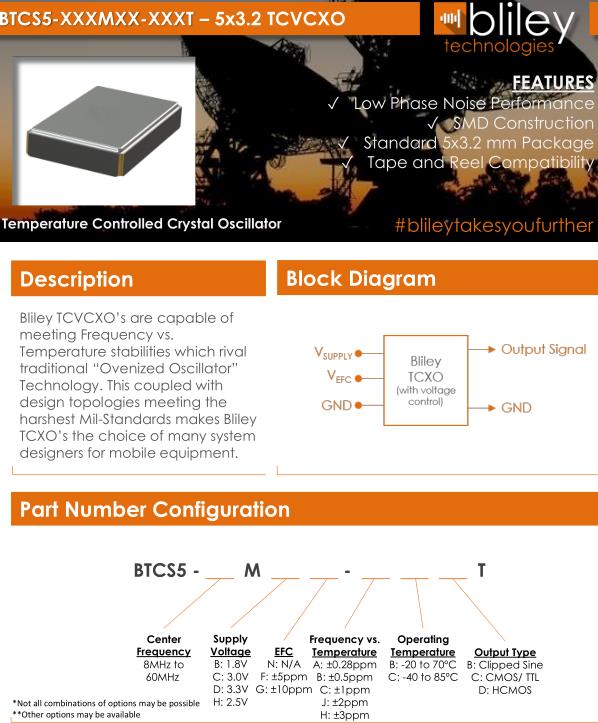 Bliley晶振,BTCS5晶振,BTCS5-20.000M-GBCDT晶振,5032mm體積的石英晶體振蕩器,有源晶振,該產品可驅動2.5V的溫補晶振,壓控晶振,VC-TCXO晶體振蕩器產品,電源電壓的低電耗型,編帶包裝方式,可對應自動高速貼片機自動焊接,及IR回流焊接(無鉛對應),為無鉛產品,超小型,質地輕.產品被廣泛應用到集成電路,程控交換系統,無線發射基站.Bliley晶振公司發展歷史: