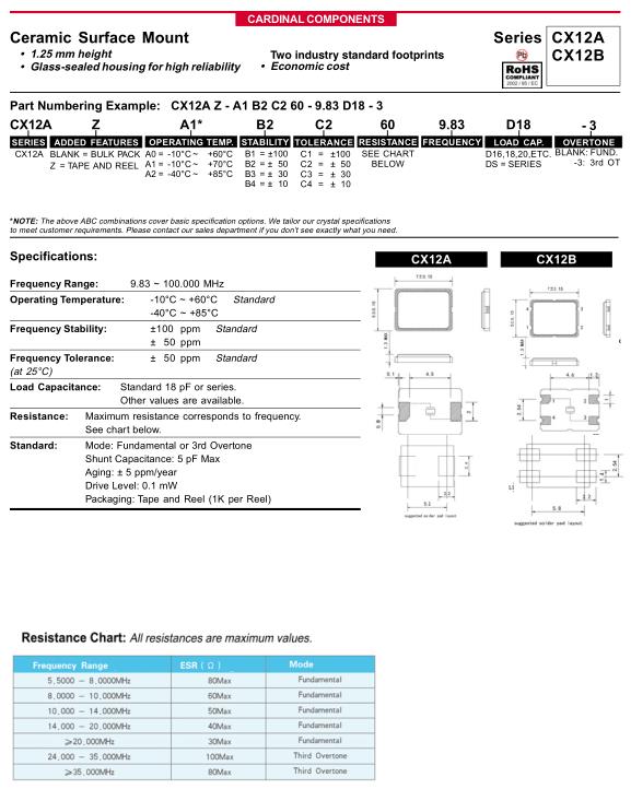 Cardinal晶振,CX12A晶振,CX12AZ-A1B2C260-9.83D18-3晶振