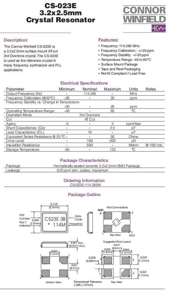 康納溫菲爾德晶振,CS-023E晶振,CS-023E-114.285M晶振