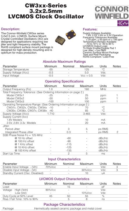 康納溫菲爾德晶振,CW34晶振,CW333-024.000M晶振,小型SMD有源晶振,從最初超大體積到現(xiàn)在的7050mm,6035mm,5032mm,3225mm,2520mm體積,有著翻天覆地的改變,體積的變小也使產(chǎn)品帶來了更高的穩(wěn)定性能,接縫密封石英晶體振蕩器,精度高,覆蓋頻率范圍寬的特點,SMD高速自動安裝和高溫回流焊設計,Optionable待機輸出三態(tài)輸出功能,電源電壓范圍:1.8V~5V,高穩(wěn)定性,低抖動,低功耗,主要應用領域:無線通訊,高端智能手機,平板筆記本W(wǎng)LAN,藍牙,數(shù)碼相機,DSL和其他IT產(chǎn)品的晶振應用,三態(tài)功能,PC和LCDM等高端數(shù)碼領域,符合RoHS/無鉛.