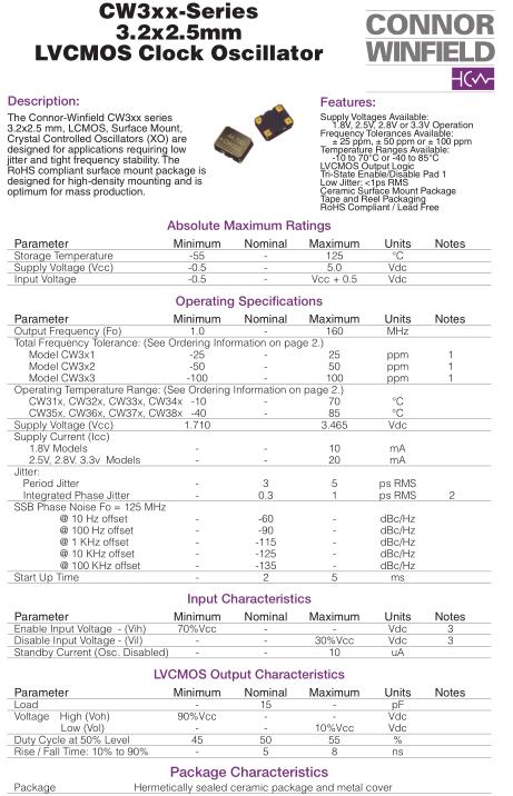 ConnorWinfield晶振,CW38晶振,CW333-016.000M晶振,小型SMD有源晶振,從最初超大體積到現在的7050mm,6035mm,5032mm,3225mm,2520mm體積,有著翻天覆地的改變,體積的變小也使產品帶來了更高的穩定性能,接縫密封石英晶體振蕩器,精度高,覆蓋頻率范圍寬的特點,SMD高速自動安裝和高溫回流焊設計,Optionable待機輸出三態輸出功能,電源電壓范圍:1.8V~5V,高穩定性,低抖動,低功耗,主要應用領域:無線通訊,高端智能手機,平板筆記本WLAN,藍牙,數碼相機,DSL和其他IT產品的晶振應用,三態功能,PC和LCDM等高端數碼領域,符合RoHS/無鉛.