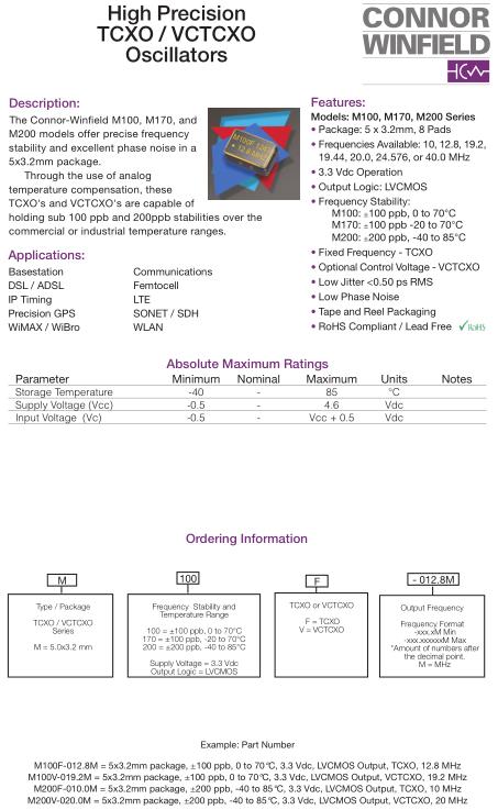 康納溫菲爾德晶振,M170V晶振,M170V-20MHz晶振,5032mm體積的石英晶體振蕩器,有源晶振,該產品可驅動2.5V的溫補晶振,壓控晶振,VC-TCXO晶體振蕩器產品,電源電壓的低電耗型,編帶包裝方式,可對應自動高速貼片機自動焊接,及IR回流焊接(無鉛對應),為無鉛產品,超小型,質地輕.產品被廣泛應用到集成電路,程控交換系統,無線發射基站.