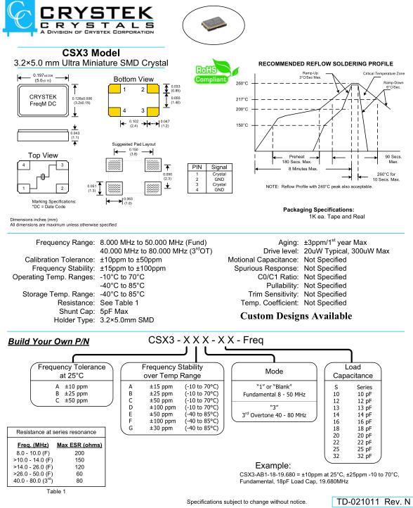 Crystek晶振,CSX3晶振,CSX3AD314-24.000M晶振,小型表面貼片晶振型,是標準的石英晶體振蕩器,適用于寬溫范圍的電子數碼產品,家電電器及MP3,MP4,播放器,單片機等領域.可對應8.000MHz以上的頻率,在電子數碼產品,以及家電相關電器領域里面發揮優良的電氣特性,滿足無鉛焊接的回流溫度曲線要求.
