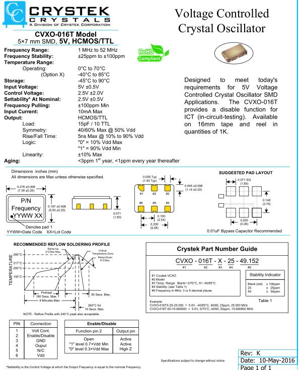 Crystek晶振,CVXO-016T晶振,CVXO-016T-X-25-49.152晶振,壓控晶振(VCXO),壓控石英晶體振蕩器基本解決方案,PECL輸出,輸出頻率60MHz到200MHz之間,出色的低相位噪聲和抖動,三態(tài)功能,應(yīng)用:SDH/SONET,以太網(wǎng),基站,筆記本晶振應(yīng)用,符合RoHS/無鉛.