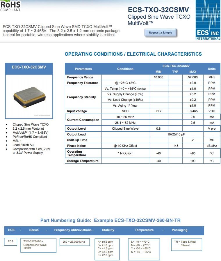 | ECS-TXO-3225-100-TR | ECS Crystal | ECS-TXO-3225 | 10MHz | -30°C ~ 85°C |