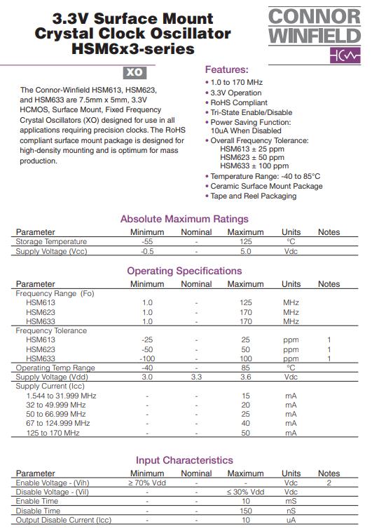 SPXO振蕩器特點:1.0至170MHz,3.3V工作電壓,符合RoHS標準,三態使能/禁用,省電功能: 禁用時10uA,整體頻率容差: HSM613,25ppm,HSM623,50 ppm,HSM633,100ppm溫度范圍:-40至85攝氏度,陶瓷表面貼裝封裝,膠帶和卷軸包裝.