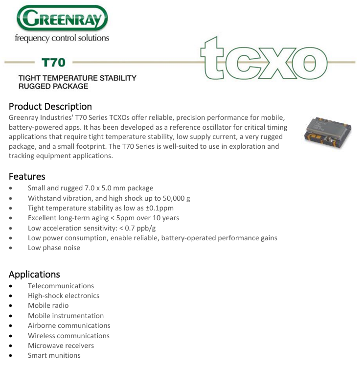 更多>>Greenray美國格林雷T70系列TCXO晶振移動應用的精準之芯