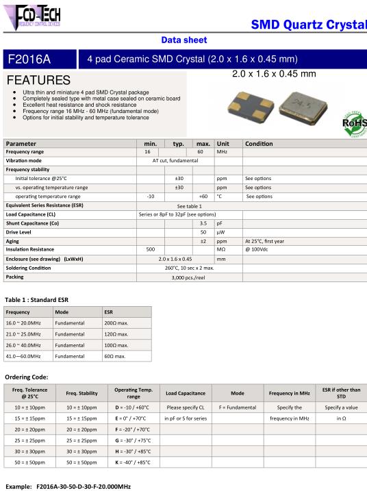 FCD-Tech晶振,F2016A晶振,F2016A‐3050D30F‐20.000MHz晶振