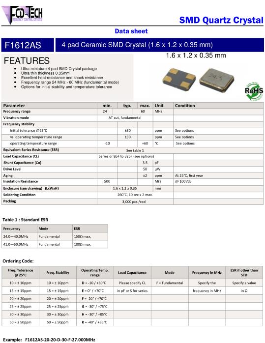 FCD-Tech晶振,F1612AS晶振,F1612AS‐2020D30F‐24.000MHz晶振,貼片晶振本身體積小,超薄型石英晶體振蕩器,特別適用于有目前高速發(fā)展的高端電子數(shù)碼產(chǎn)品,因為晶振本身小型化需求的市場領(lǐng)域,小型,薄型是對應(yīng)陶瓷振蕩器(偏差大)和普通的石英晶體振蕩器(偏差小)的中間領(lǐng)域的一種性價比較出色的產(chǎn)品.產(chǎn)品廣泛用于筆記本電腦,無線電話,衛(wèi)星導(dǎo)航SSD,USB,Blu-ray等用途,符合無鉛焊接的高溫回流焊曲線特性.