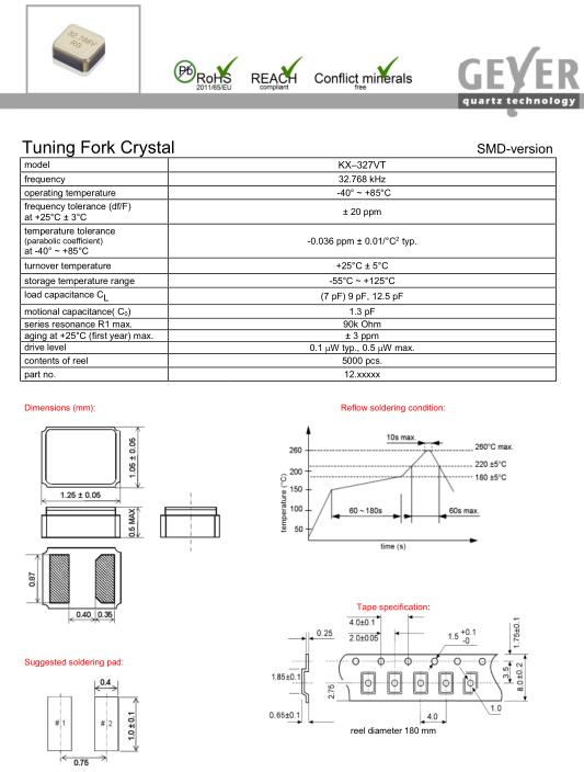 在一個不同擴張系數電路板(環氧玻璃)上焊接陶瓷封裝石英晶振時,在溫度長時間重復變化時可能導致端子焊接部分發生斷裂,請事先檢查焊接特性。格耶晶振,KX–327VT晶振,超小型晶振.