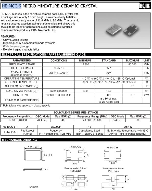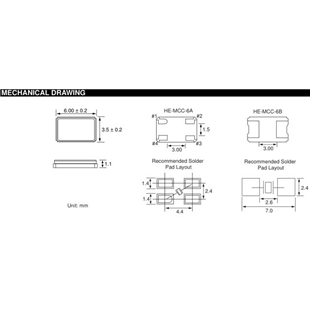 HEC晶振,HE-MCC-6晶振,壓電陶瓷晶振,貼片晶振本身體積小,超薄型石英晶體振蕩器,特別適用于有目前高速發展的高端電子數碼產品,因為晶振本身小型化需求的市場領域,小型,薄型是對應陶瓷振蕩器(偏差大)和普通的石英晶體振蕩器(偏差小)的中間領域的一種性價比較出色的產品.產品廣泛用于筆記本電腦,無線電話,衛星導航SSD,USB,Blu-ray等用途,符合無鉛焊接的高溫回流焊曲線特性.