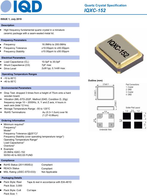IQD晶振,IQXC-152晶振,20.0MHz-IQXC-152-50/50晶振,小型貼片石英晶振,外觀尺寸具有薄型表面貼片型石英晶體振蕩器,特別適用于有小型化要求的市場領(lǐng)域,比如智能手機,無線藍(lán)牙,平板電腦等電子數(shù)碼產(chǎn)品.晶振本身超小型,薄型,重量輕,晶體具有優(yōu)良的耐環(huán)境特性,如耐熱性,耐沖擊性,在辦公自動化,家電相關(guān)電器領(lǐng)域及Bluetooth,WirelessLAN等短距離無線通信領(lǐng)域可發(fā)揮優(yōu)良的電氣特性,滿足無鉛焊接的回流溫度曲線要求.1979年被收購的雷擴散水晶工廠,主要以生產(chǎn)石英晶體諧振器,有源晶振,石英晶體,貼片晶振,壓控晶體振蕩器為主,產(chǎn)品廣泛用于智能家居,無線通訊,GPS導(dǎo)航,北斗衛(wèi)星導(dǎo)航等領(lǐng)域.