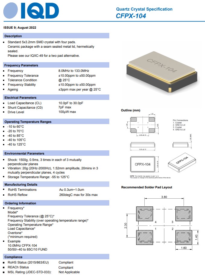 LFXTAL061633REEL,CFPX-104,5032mm,英國IQD進口晶振,移動通訊晶振,參數表