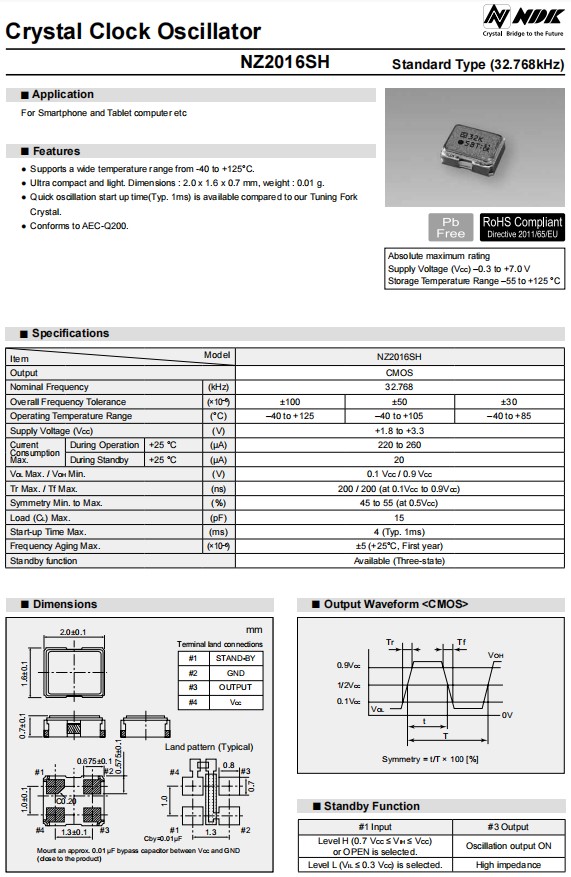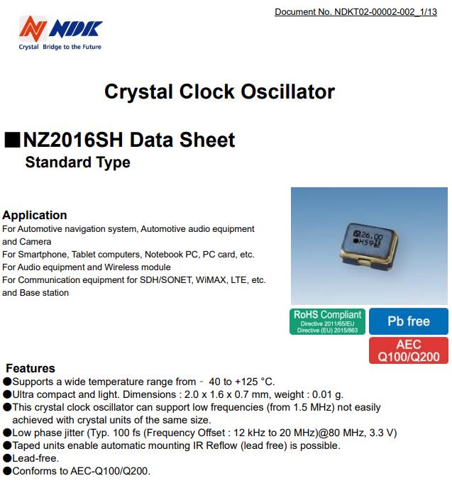 NZ2016SH-24.000MHZNSC5022C貼片振蕩器,NDK車(chē)載有源晶振NZ2016SH,是一款高質(zhì)量低電壓的SPXO振蕩器,特征 :支持–40至+125°c的寬溫度范圍 ,超緊湊和輕便。尺寸:2.0 x 1.6 x 0.7毫米,重量:0.01克 ,這種晶體時(shí)鐘振蕩器不容易支持低頻(從1.5MHz開(kāi)始) 用相同尺寸的晶體單元實(shí)現(xiàn)。 低相位抖動(dòng)(典型值。100fs(頻率偏移:12kHz至20MHz)(80MHz,3.3V) ,膠帶裝置可實(shí)現(xiàn)自動(dòng)安裝,IR回流(無(wú)鉛)是可能的。 無(wú)鉛。 符合AEC-Q100/Q200。產(chǎn)品用于汽車(chē)導(dǎo)航系統(tǒng)、汽車(chē)音響設(shè)備和照相機(jī) 用于智能手機(jī)、平板電腦、筆記本電腦、PC卡等。 用于音頻設(shè)備和無(wú)線(xiàn)模塊,適用于SDH/SONET、WiMAX、LTE等通信設(shè)備,基站.NZ2016SH-24.000MHZNSC5022C貼片振蕩器,NDK車(chē)載有源晶振NZ2016SH.