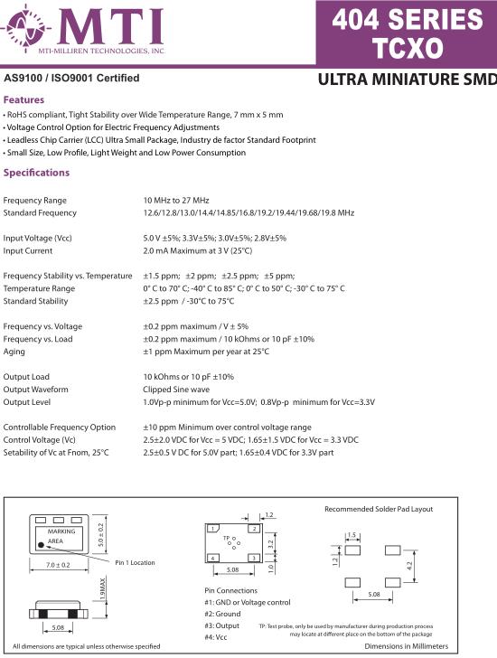 MTI晶振,404晶振,TCXO振蕩器,溫補晶振(TCXO)產品本身具有溫度補償作用,高低溫度穩定性:頻率精度高0.5PPM-2.0PPM,工作溫度范圍:-30度至85度,電源電壓:1.8V~3.3V之間可供選擇,產品本身具有溫度電壓控制功能,世界上最薄的晶振封裝,頻率:26兆赫,33.6兆赫,38.4兆赫,40兆赫,因產品性能穩定,精度高等優勢,被廣泛應用到一些比較高端的數碼通訊產品領域,GPS全球定位系統,智能手機,WiMAX和蜂窩和無線通信等產品,符合RoHS/無鉛.
