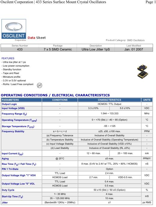 Oscilent晶振,433晶振,433-24.0M-3EN-T-TS晶振,小型SMD有源晶振,從最初超大體積到現(xiàn)在的7050mm,6035mm,5032mm,3225mm,2520mm體積,有著翻天覆地的改變,體積的變小也使產(chǎn)品帶來了更高的穩(wěn)定性能,接縫密封石英晶體振蕩器,精度高,覆蓋頻率范圍寬的特點(diǎn),SMD高速自動(dòng)安裝和高溫回流焊設(shè)計(jì),Optionable待機(jī)輸出三態(tài)輸出功能,電源電壓范圍:1.8V~5V,高穩(wěn)定性,低抖動(dòng),低功耗,主要應(yīng)用領(lǐng)域:無線通訊,高端智能手機(jī),平板筆記本W(wǎng)LAN,藍(lán)牙,數(shù)碼相機(jī),DSL和其他IT產(chǎn)品的晶振應(yīng)用,三態(tài)功能,PC和LCDM等高端數(shù)碼領(lǐng)域,符合RoHS/無鉛.Oscilent晶振公司發(fā)展歷程: