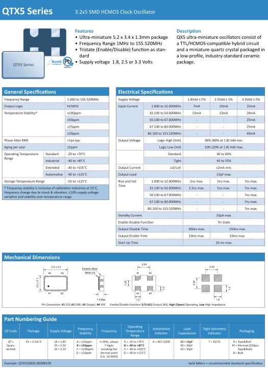 Quarztechnik晶振,QTX5晶振,QTX533B20.0000B15R晶振,小型SMD有源晶振,從最初超大體積到現在的7050mm,6035mm,5032mm,3225mm,2520mm體積,有著翻天覆地的改變,體積的變小也使產品帶來了更高的穩定性能,接縫密封石英晶體振蕩器,精度高,覆蓋頻率范圍寬的特點,SMD高速自動安裝和高溫回流焊設計,Optionable待機輸出三態輸出功能,電源電壓范圍:1.8V?5V,高穩定性,低抖動,低功耗,主要應用領域:無線通訊,高端智能手機,平板筆記本WLAN,藍牙,數碼相機,DSL和其他IT產品的晶振應用,三態功能,PC和LCDM等高端數碼領域,符合RoHS/無鉛.除標準振蕩器外,我們還生產TCXO和VCTCXO。