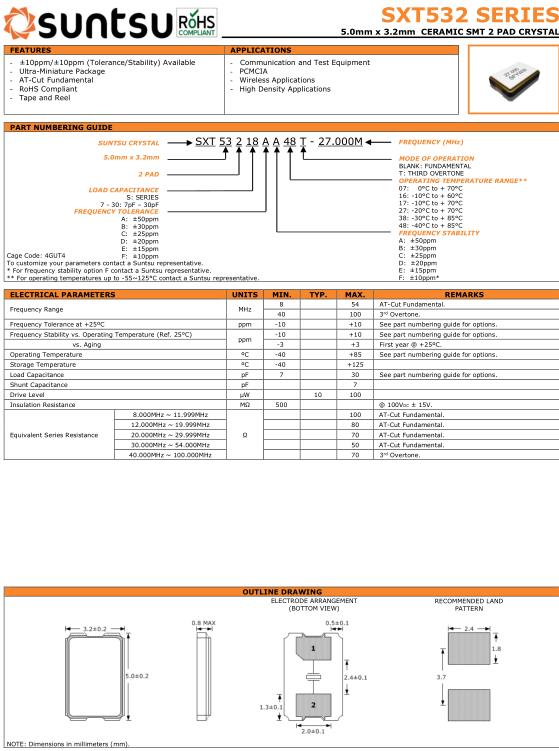 | Suntsu晶振規(guī)格 | 單位 | SXT532晶振頻率范圍 | 石英晶振基本條件 |