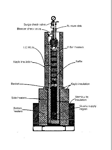 被稱為“玻璃或營養(yǎng)物”的小片純石英(1至1.5英寸大小)被放置在金屬網(wǎng)籃中,并放入容器的下半部分。在籃子的頂部有一塊預先安排好的孔的鋼板,稱為“擋板”。擋板用于分離生長(種子)區(qū)域和營養(yǎng)區(qū)域,并幫助建立兩個區(qū)域之間的溫差。適當定向的單晶板(無論是天然的還是培養(yǎng)的),稱為“種子”,安裝在架子上,懸掛在容器上半部分擋板的頂部。然后用堿性水溶液(碳酸鈉或氫氧化鈉)填充到高壓滅菌器約80%的自由體積,以允許未來的液體膨脹,并使用高壓密封。高壓滅菌器然后通過一系列的電阻加熱器連接到圓柱體的外周帶到工作溫度。隨著溫度的升高,高壓滅菌器內(nèi)開始產(chǎn)生壓力。在容器的下半部分達到700到800華氏度的溫度,而上半部分保持在70到80華氏度,比下半部分低。